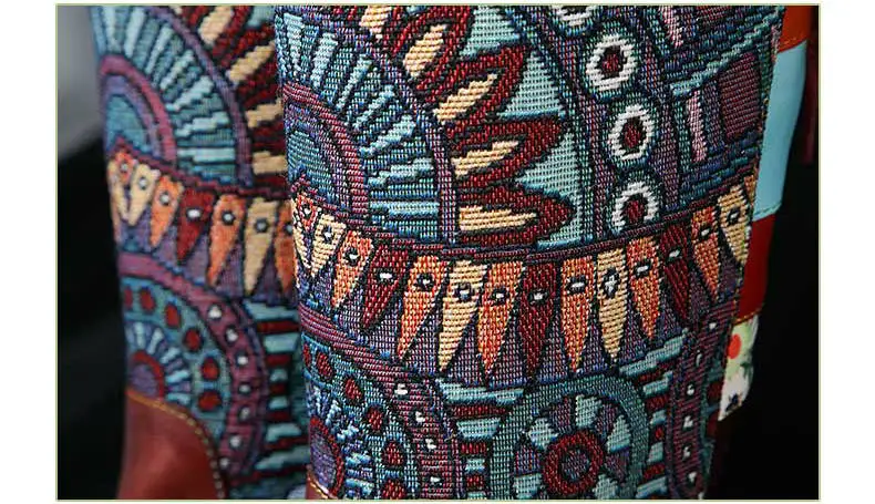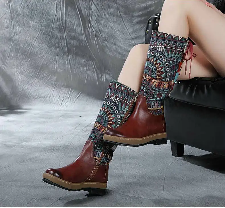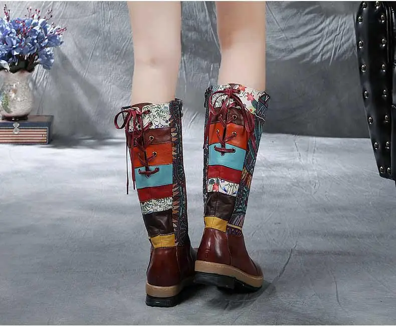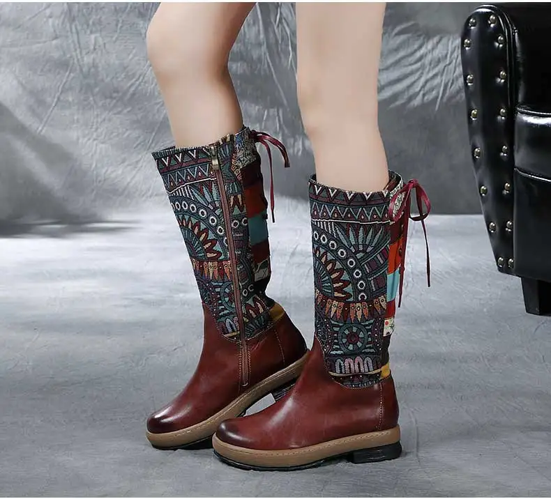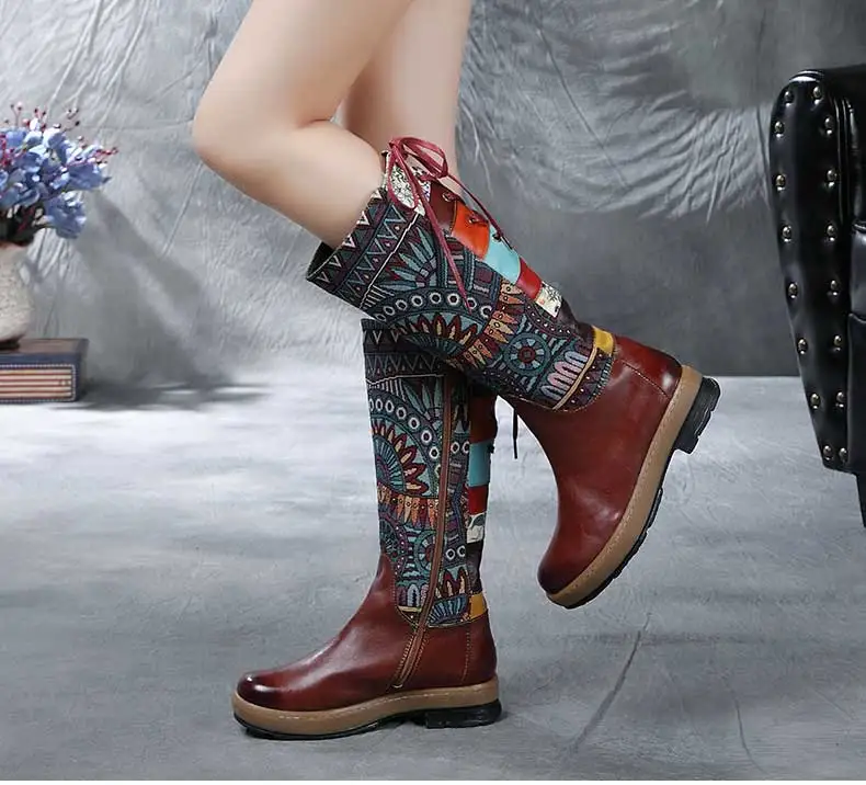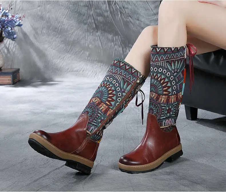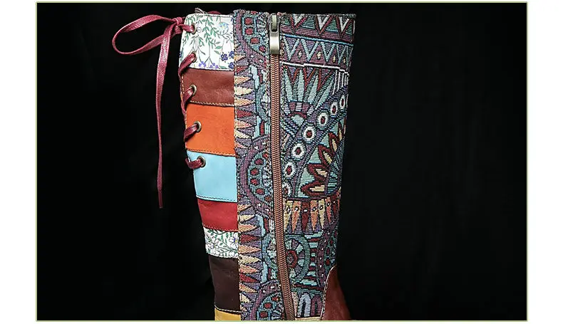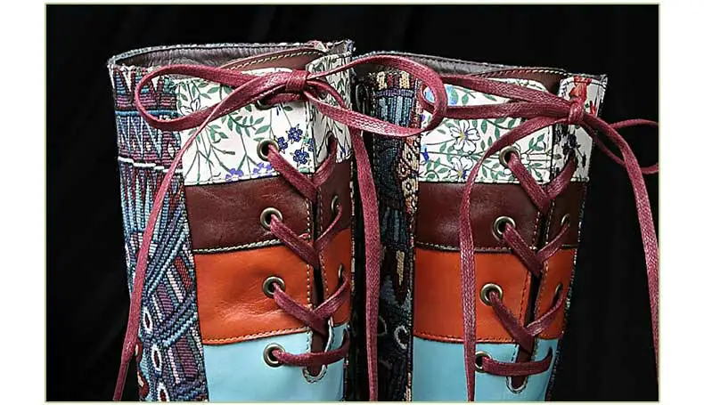 Women Embroidered Lace Up Genuine Leather Tall Boots