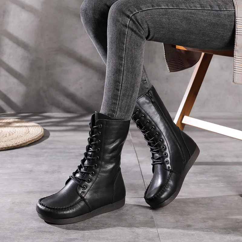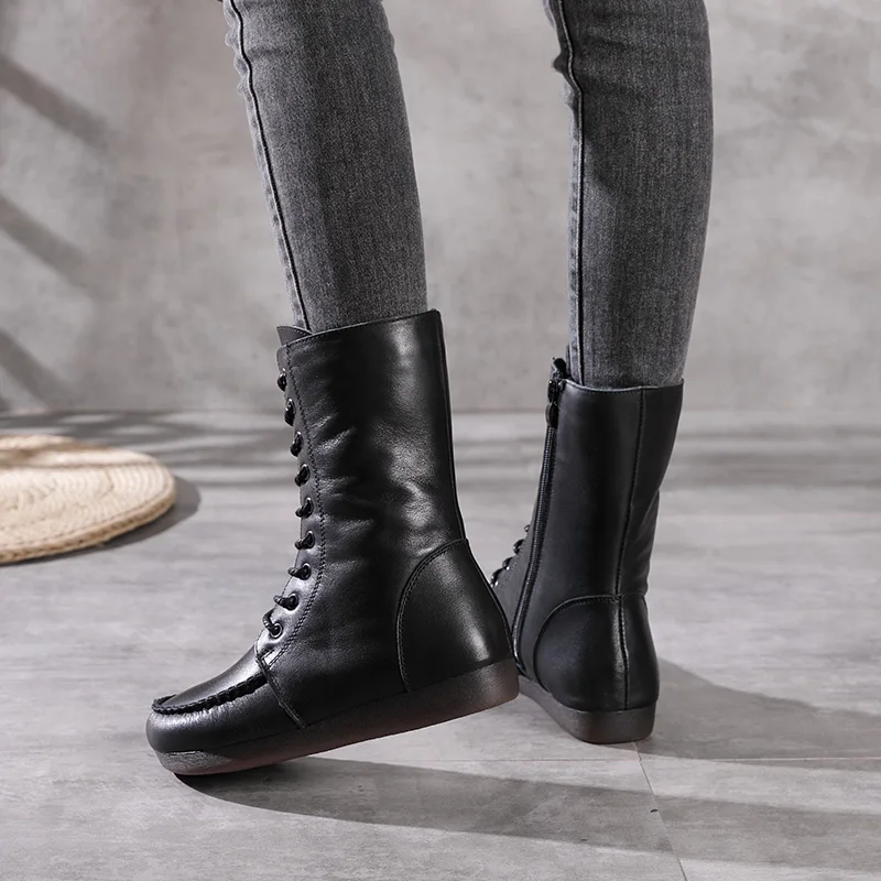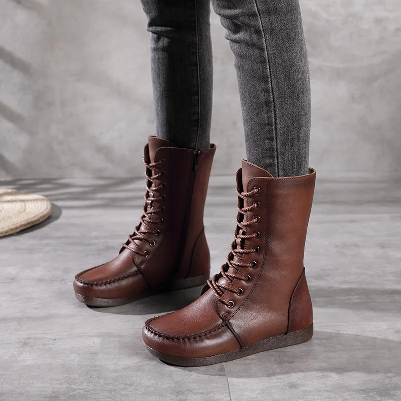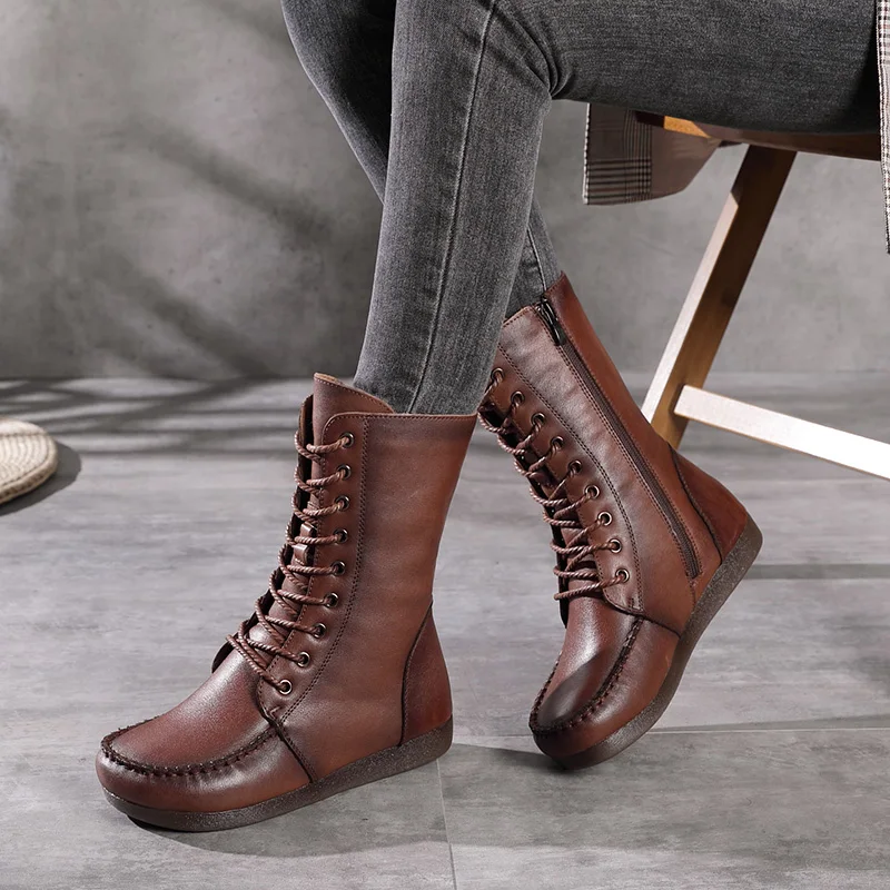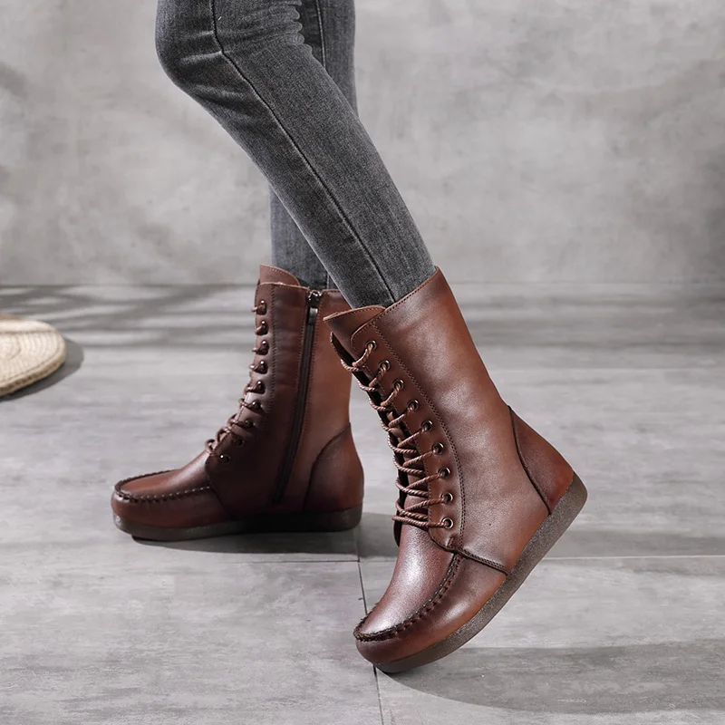 Women Lace Up Medium Top Genuine Leather Boots 3766