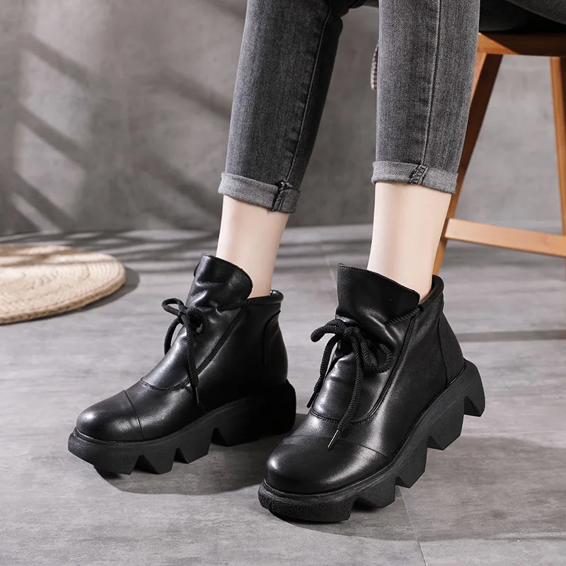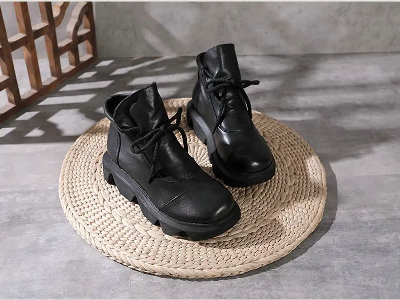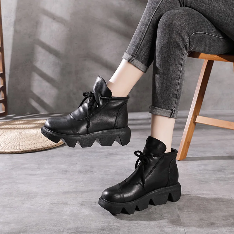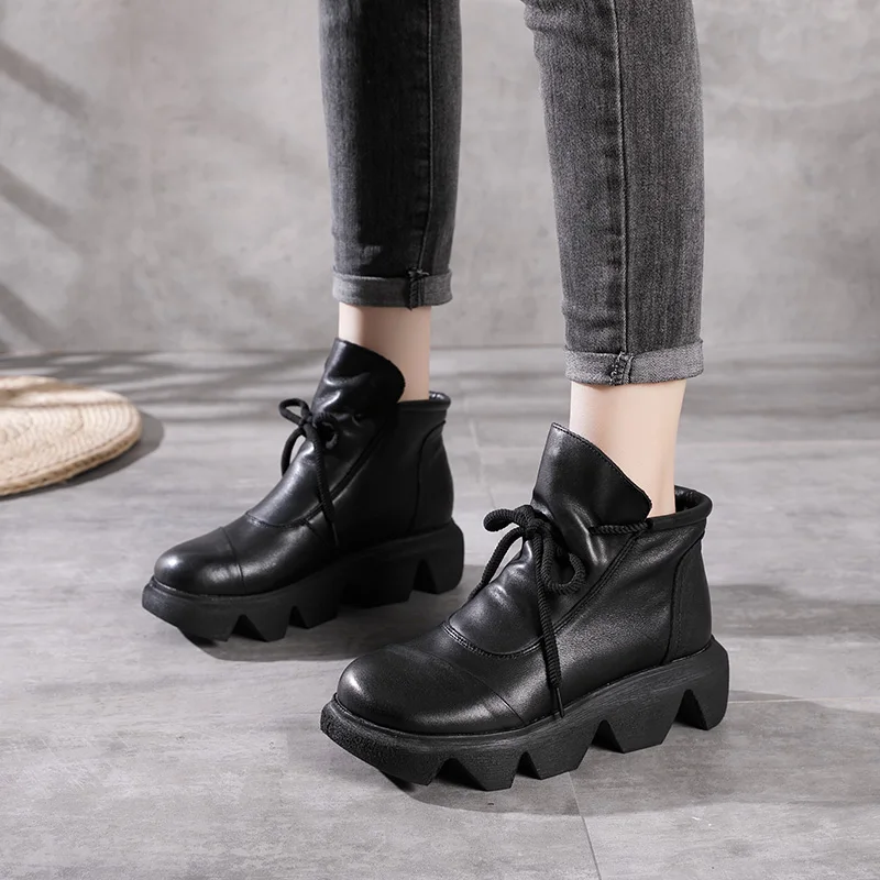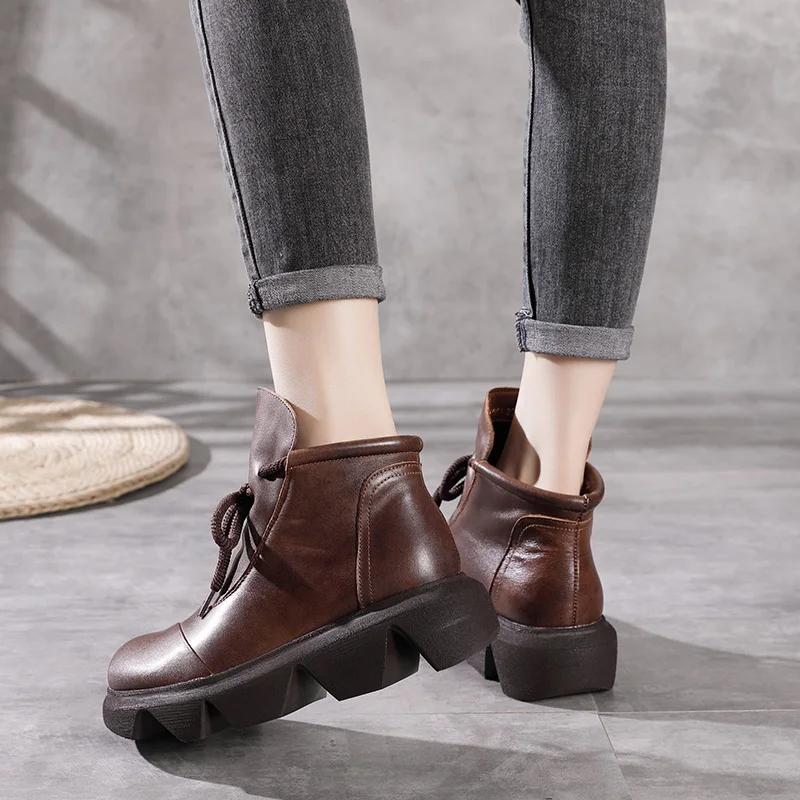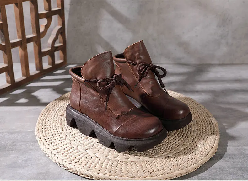 Women Round Toe Genuine Leather Lace Up Platform Boots 3672